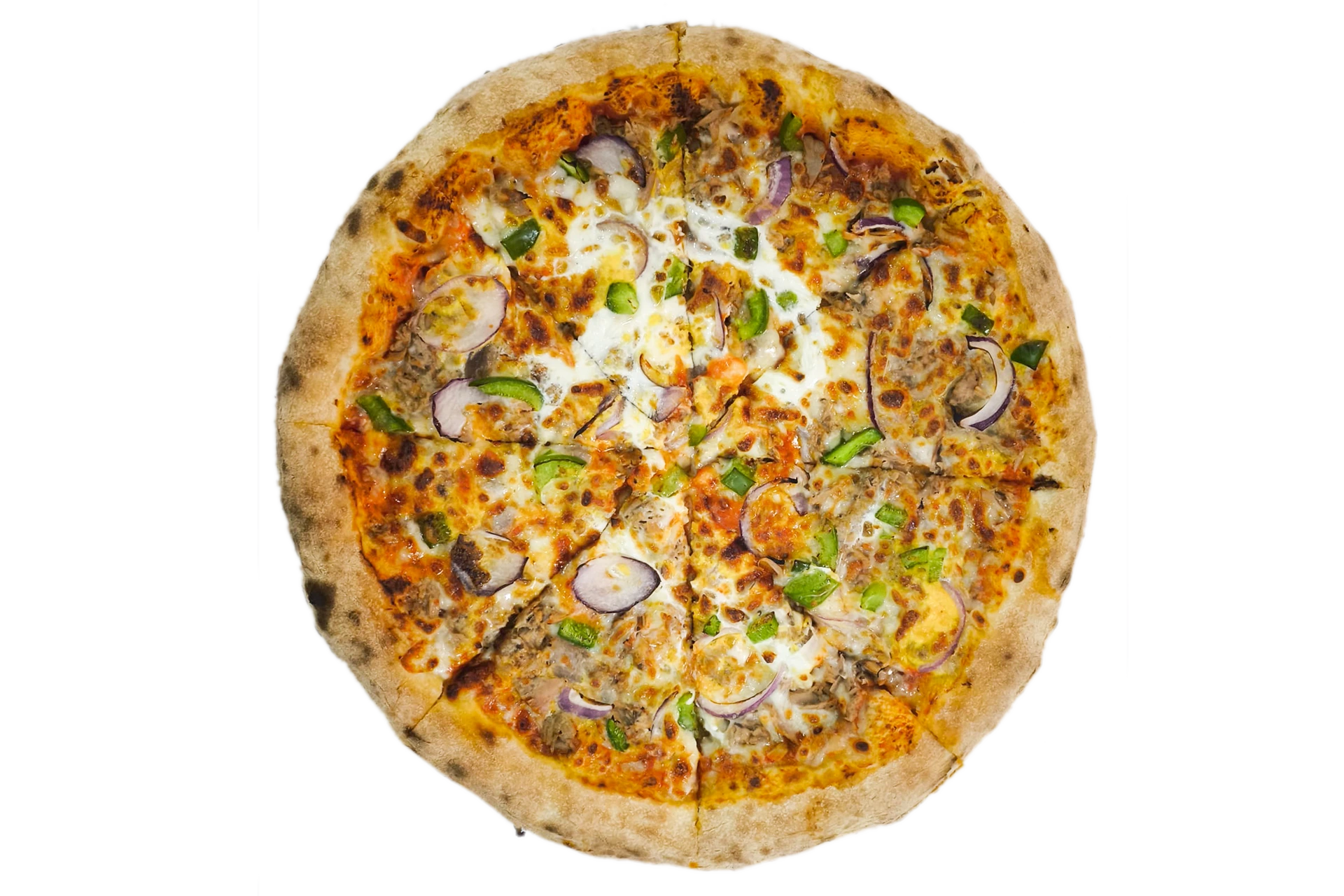 Sauce tomate, harissa, mozzarella, thon, poivrons, oignons, oeuf