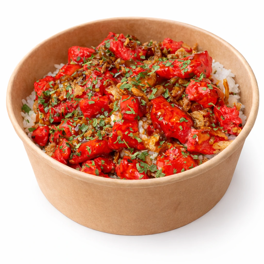 Riz parfumé, poulet tandoori savoureux, persil, oignons frits, sauce sucrée ou chili thaï et sauce maison
