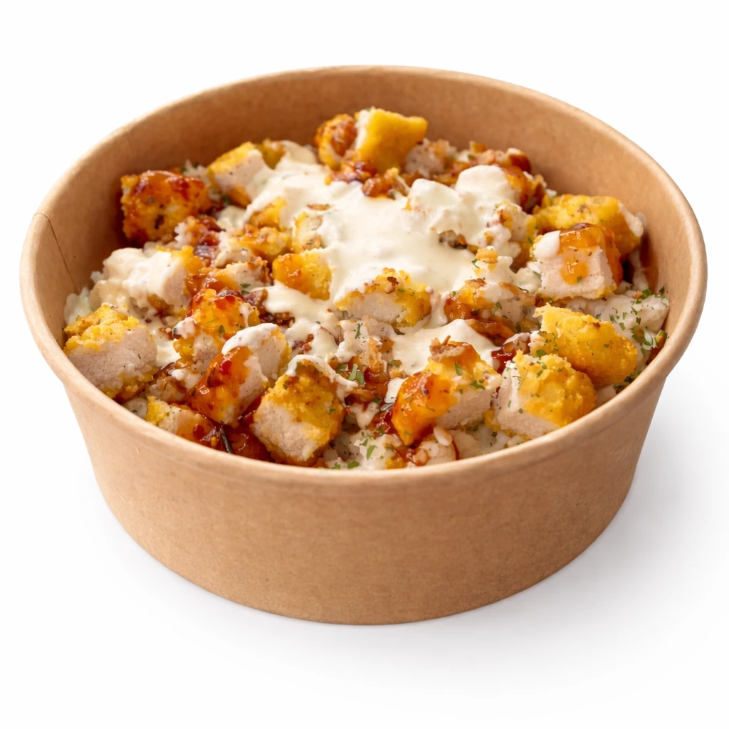 Riz parfumé, tenders croustillants, persil, oignons frits, sauce sucrée ou chili thaï et sauce maison