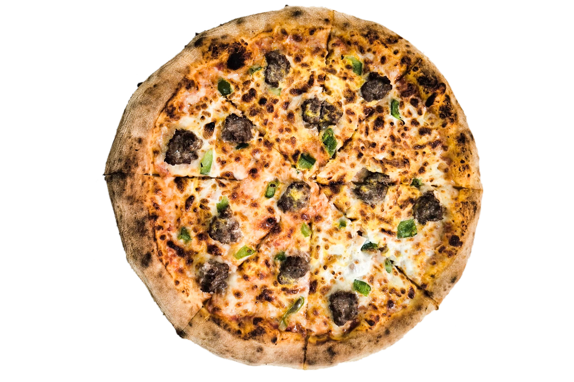 Sauce tomate, mozzarella, viande hachée, poivrons, oeuf